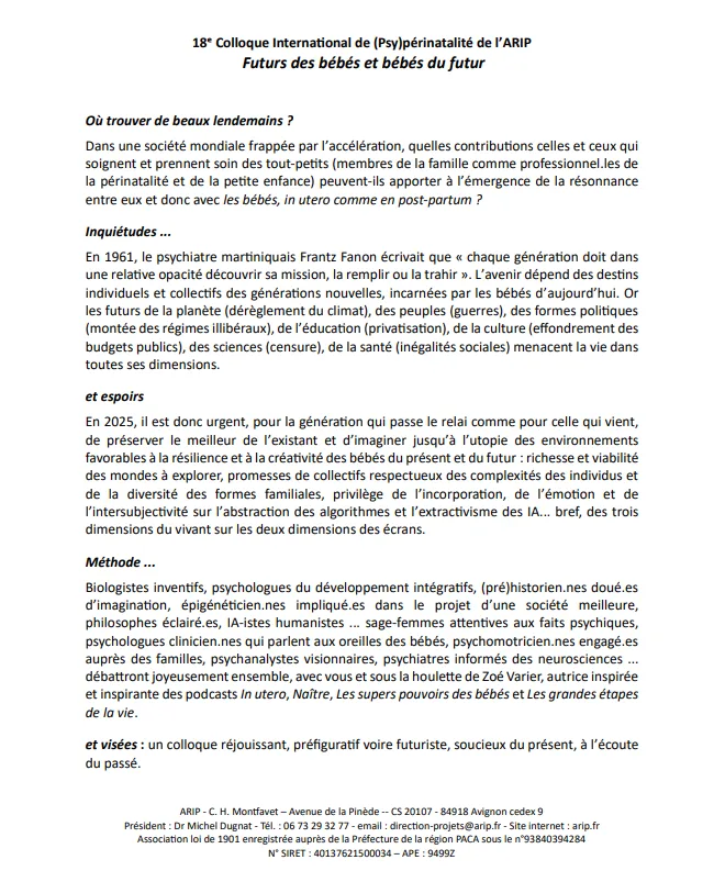 Pour ce congrès de mars 2025, nous donnerons la parole à des intervenants spécialisés dans le domaine de la périnatalité et dans celui des 1000 premiers jours, c’est-à-dire dès la conception du bébé jusqu’à l’âge de 2 ans.